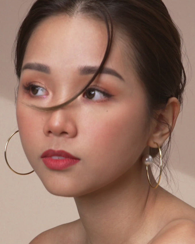 The perfectly round pearls are perched on the end of the open hoop, echoing circular motions of eternity to its timelessly elegant design.